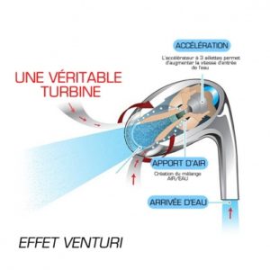 La douchette « Ecoxygen » (Drop Zone Energy) exploite l’effet Venturi pour créer une dépression qui aère l’eau. Simultanément, son accélérateur à ailettes augmente la vitesse d’entrée du précieux liquide. Résultat : un débit réduit de moitié (voire plus) en conservant un jet puissant.